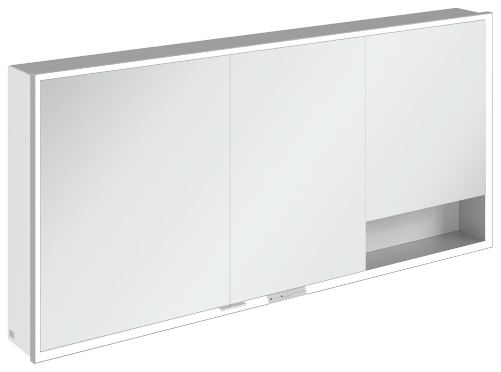 3 x Tür, 1 x Sensorschalter außen, 2 x Steckdose innen, 4 x Ablageboden aus Aluminium, 1 x offenes Fach rechts unten, 1 x Ablageschale, 1 x Vergrößerungsspiegel, 1 x Magnetleiste, IP 44, Montage vor der Wand, Aufputz, mit Befestigungsset