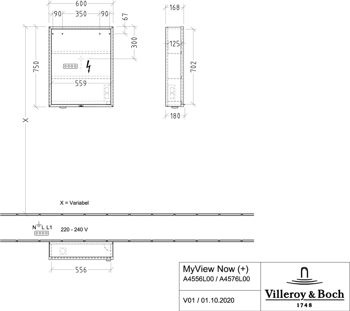 V&B Spiegelschrank My View + 60 x 75 x 16,8 cm, Scharnier Anschlag links, verspiegelt, LED-Beleuchtung, Aluminium silber matt eloxiert