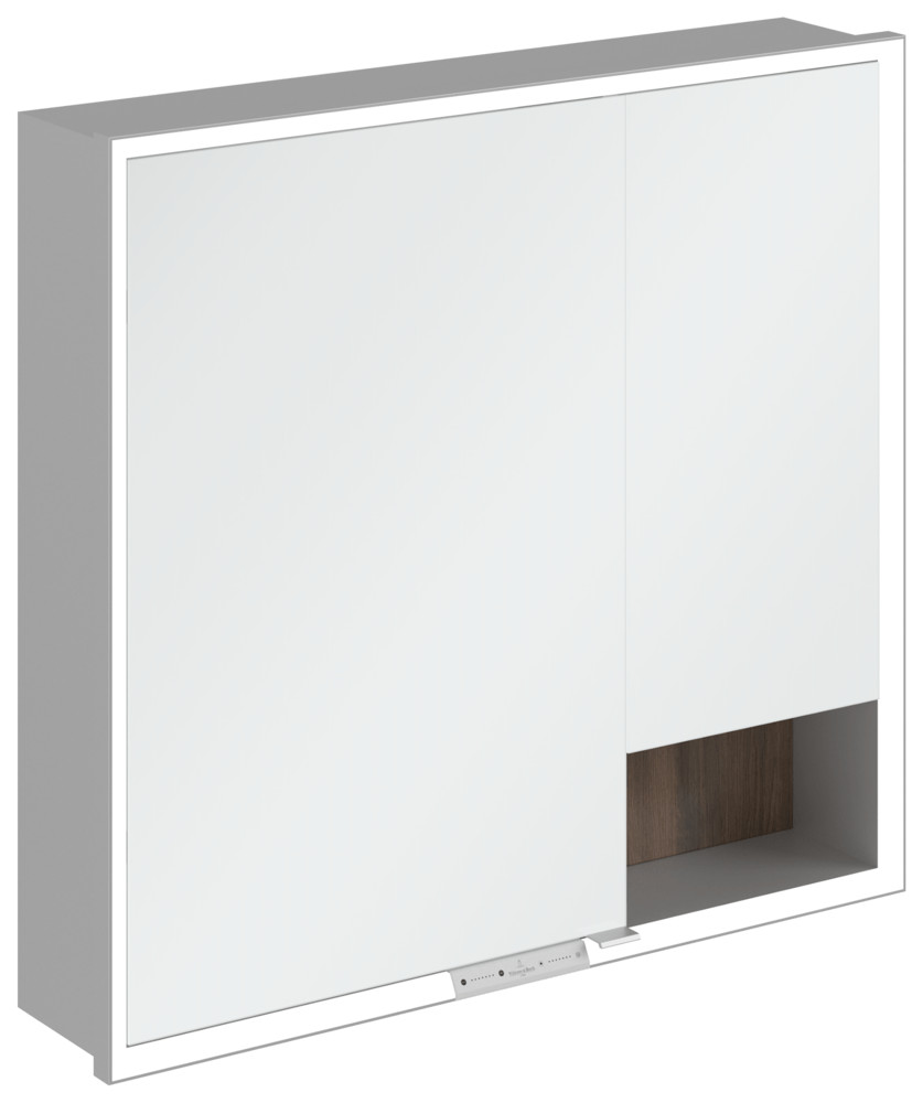 2 x Tür, 1 x Sensorschalter außen, 2 x Steckdose innen, 4 x Ablageboden aus Aluminium, 1 x offenes Fach rechts unten, 1 x Ablageschale, 1 x Vergrößerungsspiegel, 1 x Magnetleiste, IP 44, Montage in der Wand, Einbau, mit Befestigungsset