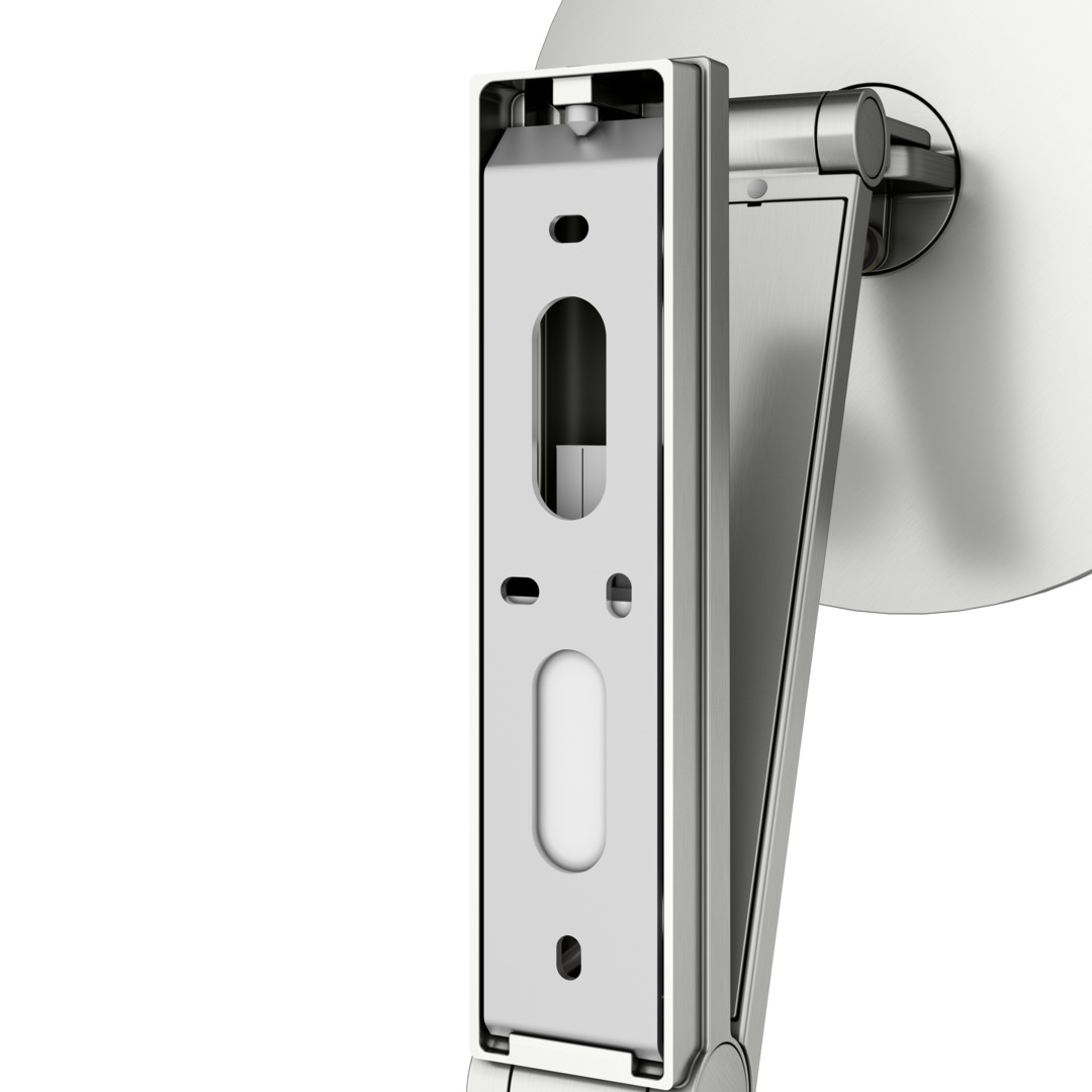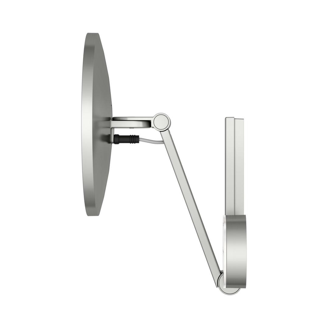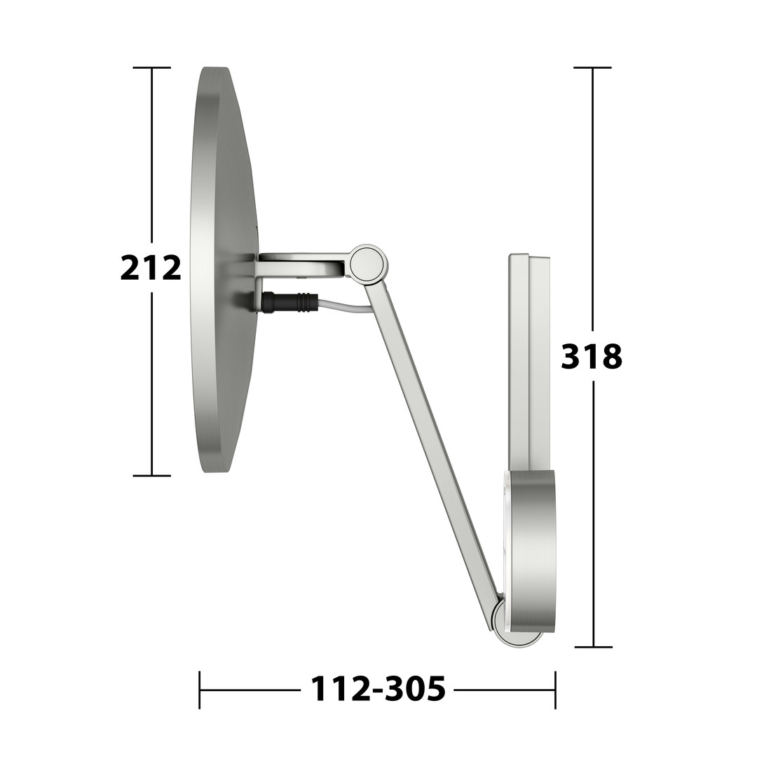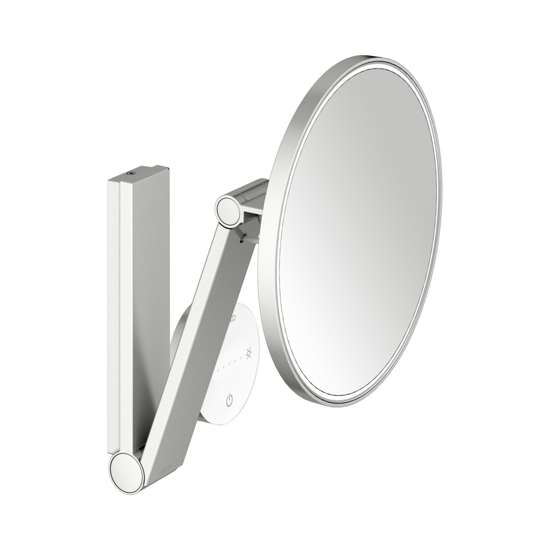 mit UP-Kabelführung, Schutzart IP 24, Wandmontage, rund, 3-dimensionaler Gelenkarm, Spiegel einseitig, konkav, Vergrößerungsfaktor x5, Bedienung Glasbedienfeld mit kapazitiver Touch-Sensorik und LED-Anzeige, Beleuchtung 2700 Kelvin (warmweiß) bis 6500 Kelvin (tageslichtweiß), LED 4,5 Watt, Netzanschluss mit UP-Dose und Leerrohr erforderlich