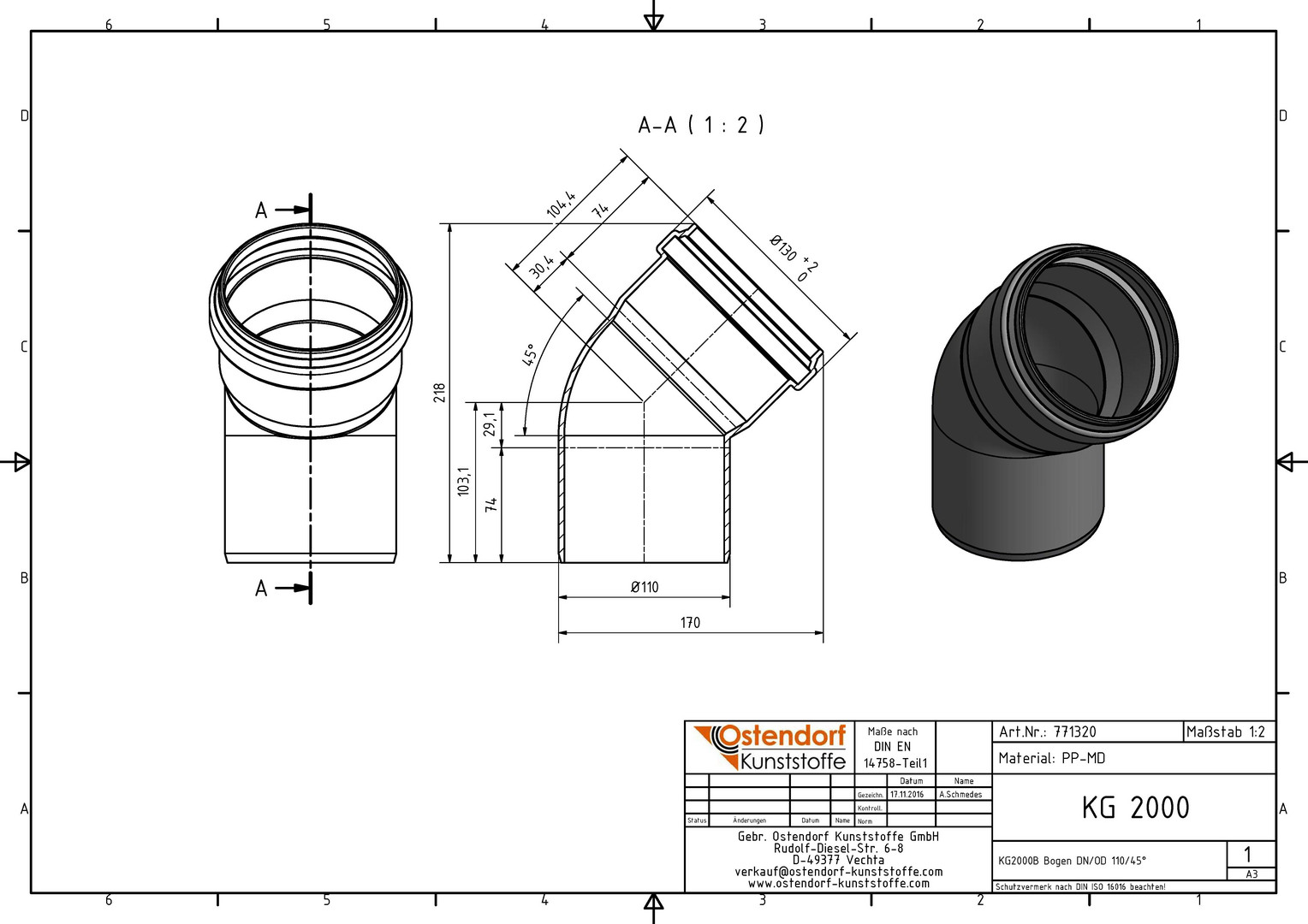 Ostendorf KG2000 Bogen B DN/OD 110, 45Grad