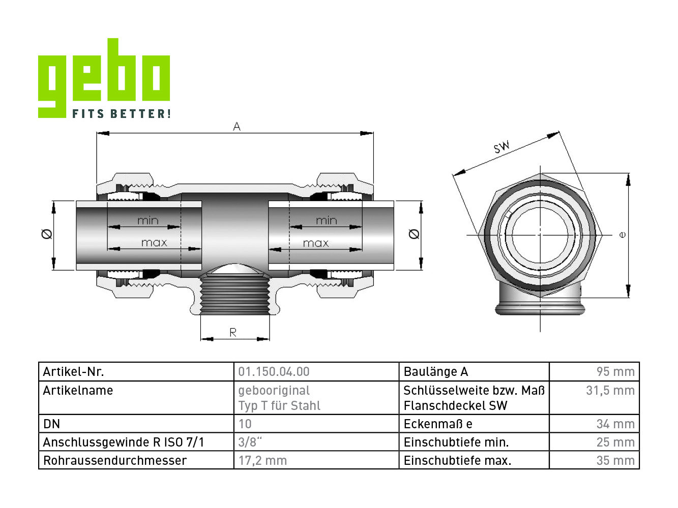 Gebo Verschraubung T Serie 150 17,2 mm x 3/8" x 17,2 mm, für Stahlrohr
